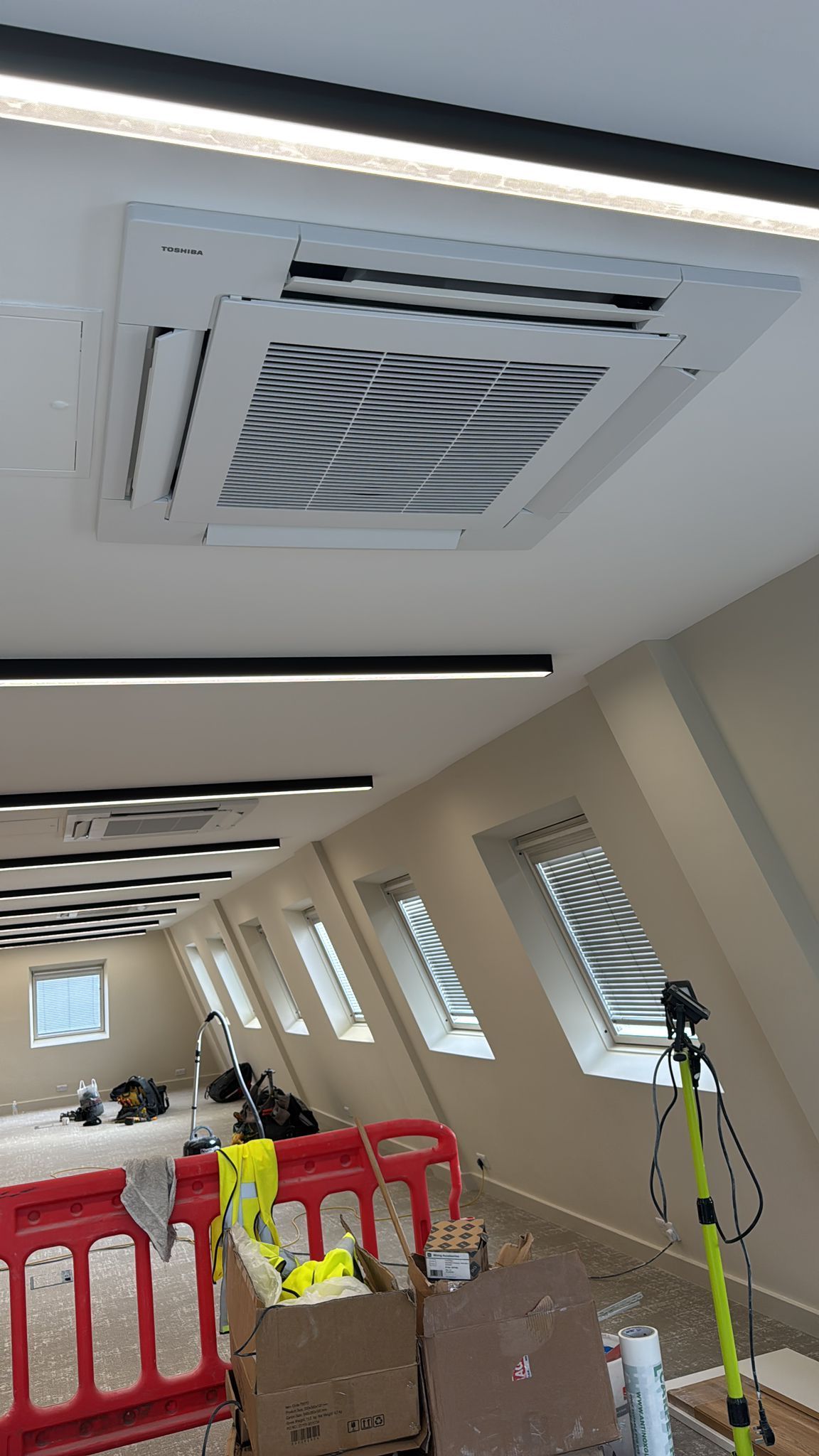 Multiple cassette units were precisely fitted within the main office ceiling. Refrigerant and drainage pipework were concealed for a seamless look, while a central control interface enabled independent zone management. All units were pressure-tested, vacuumed, and commissioned by our F-Gas-certified engineers for optimal performance and compliance.
